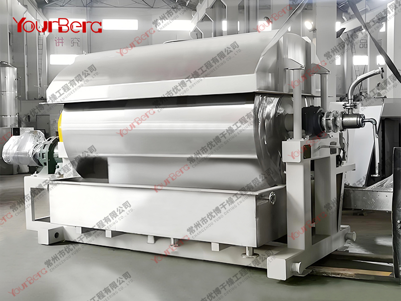滾筒刮板干燥機是一種內加熱傳導型轉動連續干燥設備。旋轉的滾筒通過其下部料槽,粘附著一厚度的料膜,熱量通過管道輸送至滾筒內壁,傳導到滾筒外壁,再傳導給料膜,使料膜中的濕得到蒸發、脫濕、使含濕分的物料得到干燥。干燥好的物料被裝置在滾筒表面的刮刀鏟離滾筒,到置于刮刀下方的螺旋輸送器,通過螺旋輸送器將干物料···